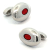 Timeless red oval cufflinks. The sleek oval design features a striking red accent that adds a pop of colour to your cuffs, making them a standout accessory for any occasion. Whether you're dressing for a black-tie event or a business meeting, these cufflinks effortlessly enhance your style and make a bold statement. Finished in shiny rhodium plating.