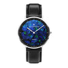 With its magnificent spectrum of colour, the Roland Pedy Blue Swiss Opal Watch is definitely an enchanting timepiece. The 40mm face,cased in silver colour features a mesmerising mosaic of opals encircled by a sleek silver on black stick index. The Black Leather Strap perfectly complements this elegant style.